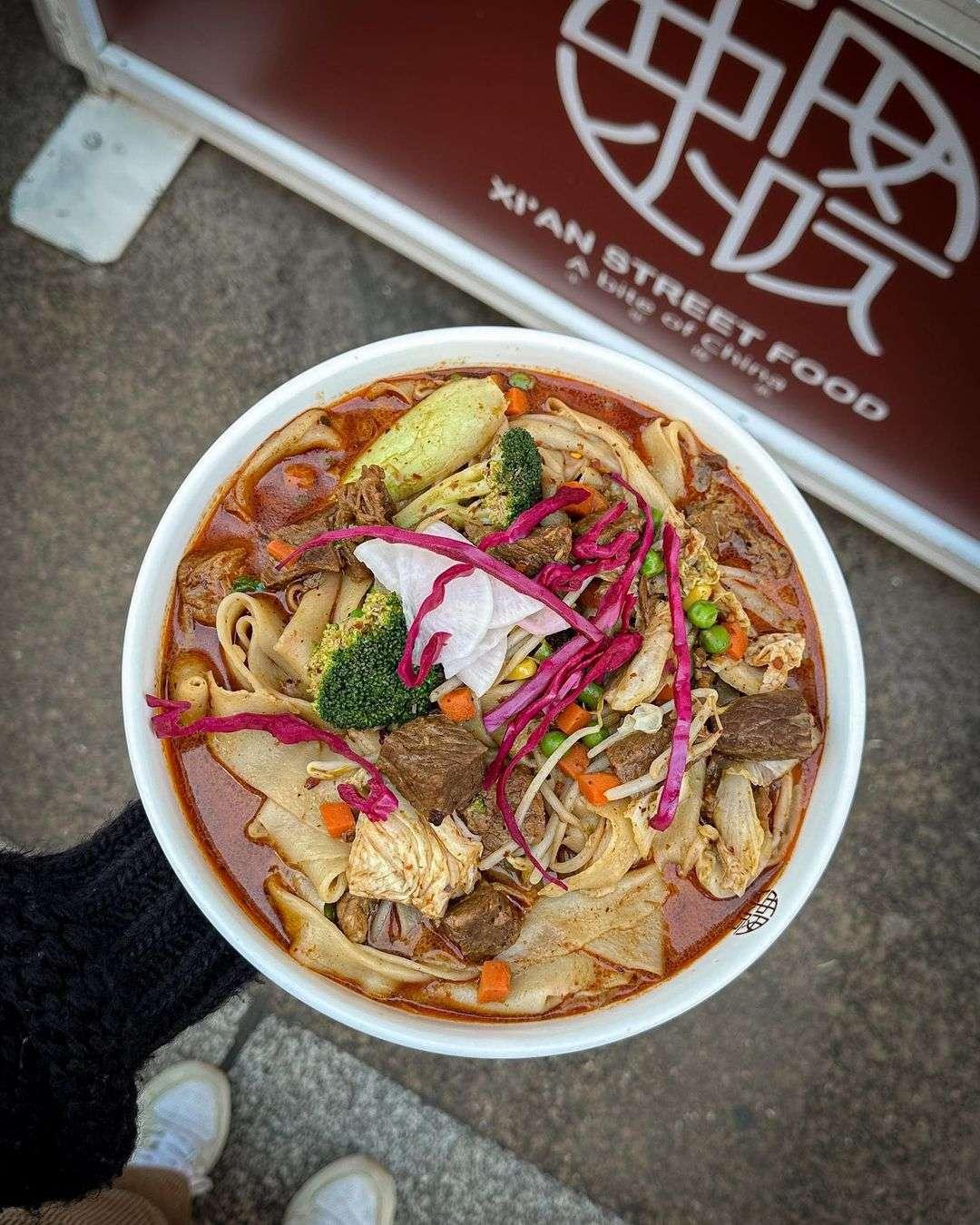 Their menu includes the Xi’An meat buger (or, Roujiamo), which is like a hamburger, but with a much longer history. Lean pork is braised for hours – then hand-shredded and finally pocketed in the bread – we’re hungry just thinking about it. Xi’An Street Food’s signature dish, and arguably their most popular, is the Biang Biang noodle dish.
