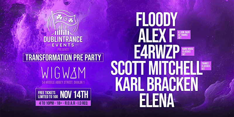 Free pre party for Transformation special with an unreal lineup Who’s ready ? We are announcing we are having an 11.5 hour rave in Dublin City on the 14th of November our free pre party in @wigwamdublin then our main event after in @sohodublin let’s get ready people for a…