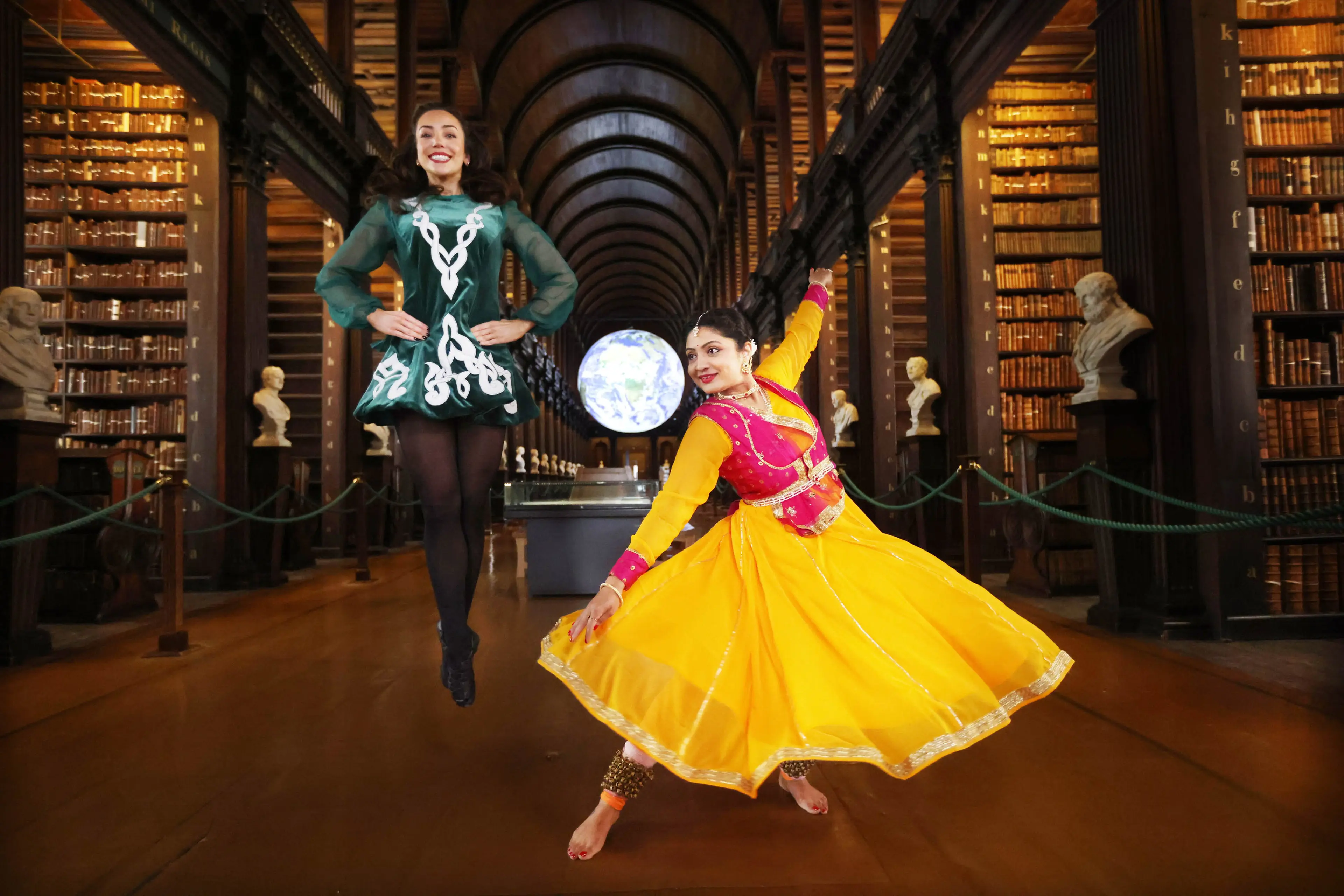 NO REPRO FEE Dublin, Ireland. Adrianna Lynch and Nupoor Mathankar pictured at the Long Room in Trinity College Library, Dublin, at the launch of JLF Island of Ireland. Taking place from 22–31 May 2026 across Belfast, Armagh, Dundalk and Dublin. Supported by the Government of Ireland and the Arts Council of Northern Ireland, the festival will bring together leading Irish and international writers and thinkers for a dynamic programme of events. For more information, visit https://jlflitfest.org/ireland Photographer: Leon Farrell / Photocall Ireland