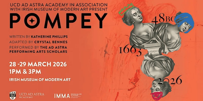 Crystal Bennes presents Pompey, a performance presented in association with UCD Ad Astra Academy and IMMA. Dates: 28 & 29 March, 1pm, 3pm Location: IMMA, North Range. Meeting point: reception desk Price: €12 full price / €10 concession In 1663, history was made at Dublin’s Smock Alley Theatre when the first English-language play…