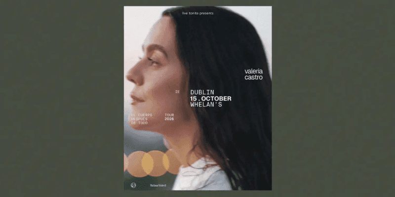 At the height of a meteoric rise, Canary Islands–born artist Valeria Castro returns to Dublin following a sold-out debut. After performing to 9,000 fans in Madrid, 2026 marks her full breakthrough, with an international tour spanning major arenas and festivals across Europe and seven cities in Latin America.